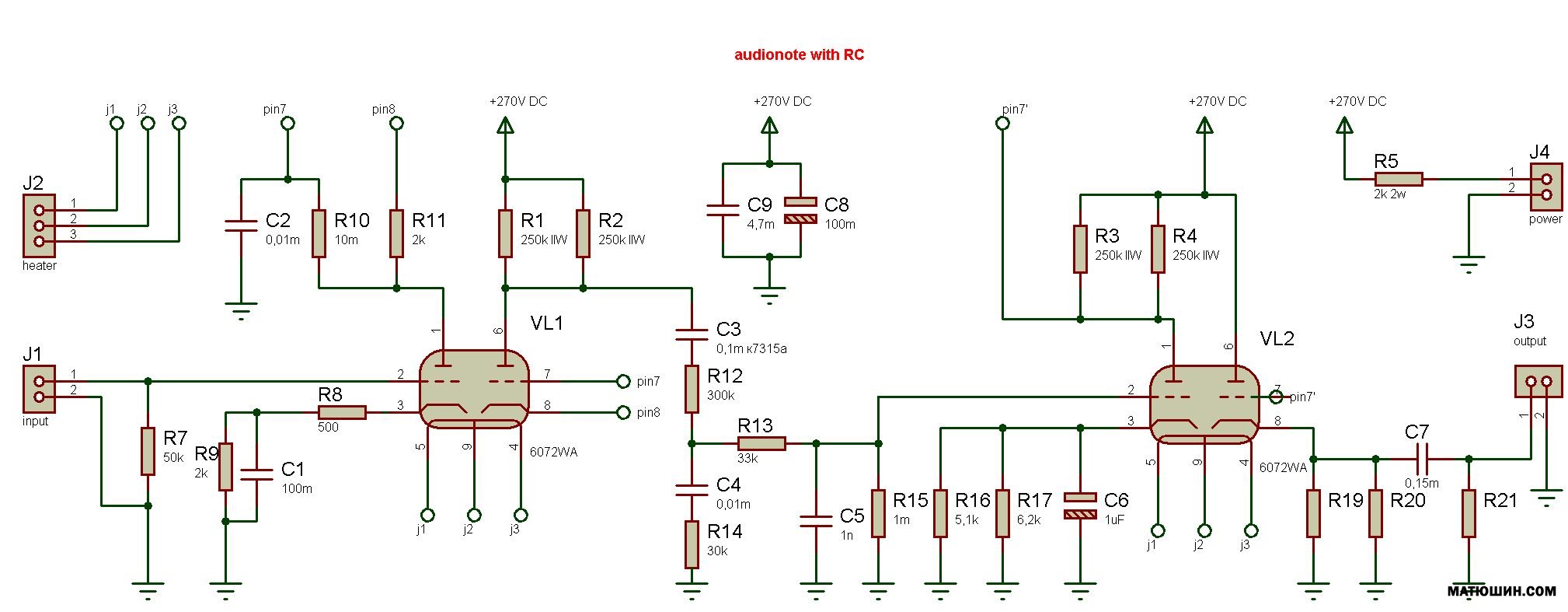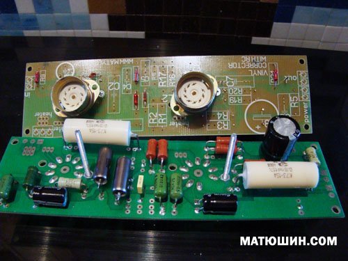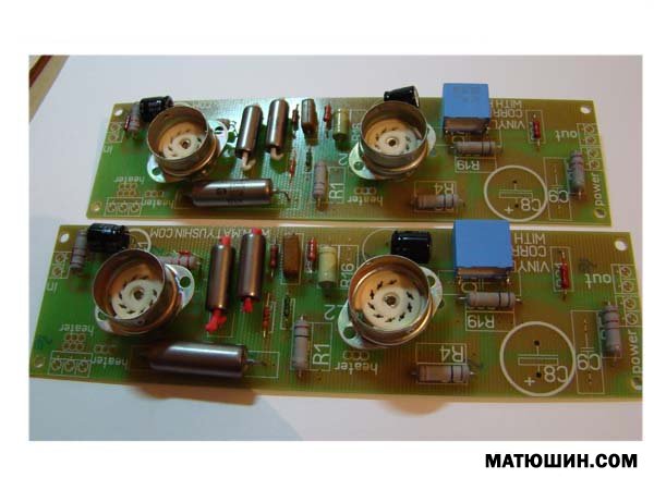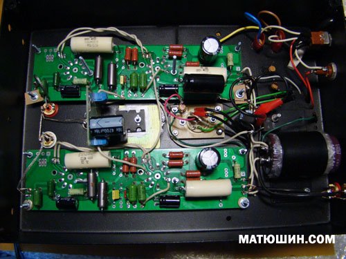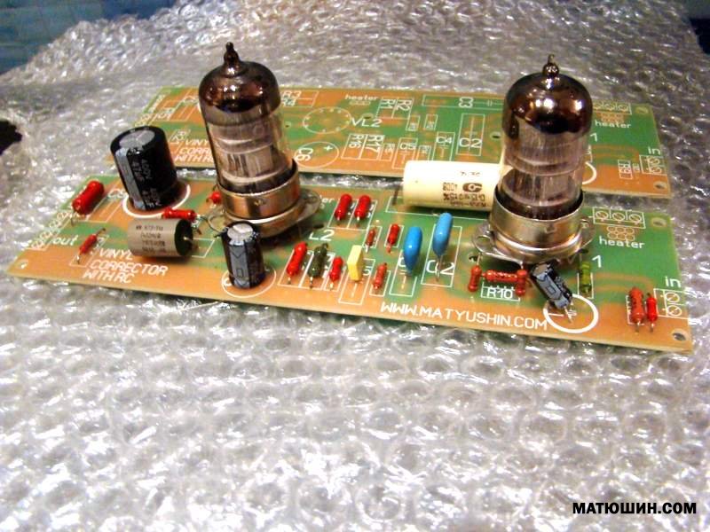 Лампочки 6Н2П-ев, так же на вход можно ставить 6Н23П.Накал постоянным током естественно! Возможна установка ламп типа 12АХ7. Работает достойно! Паразитных шумов нет даже с открытыми входами! За две голышки 700р.