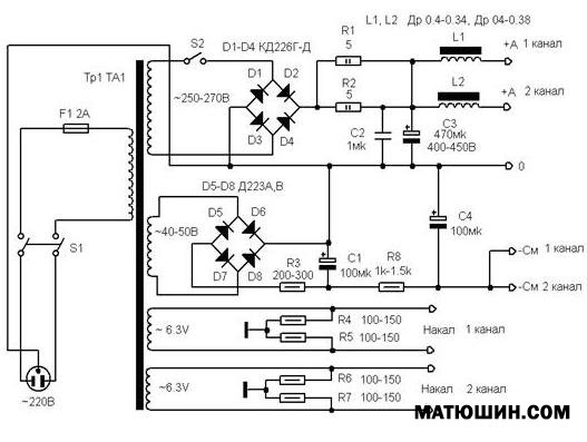 Силовик вот примерно для этой схемы, только на два канала и для анодного питания 420В=400мА