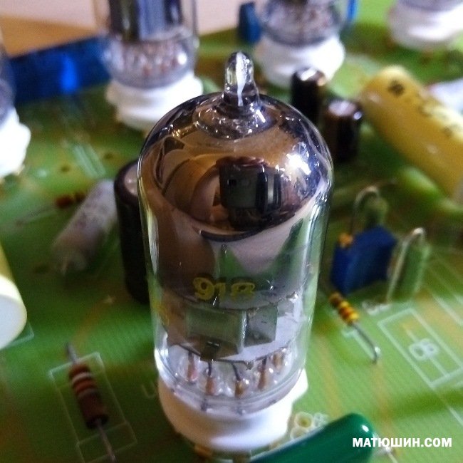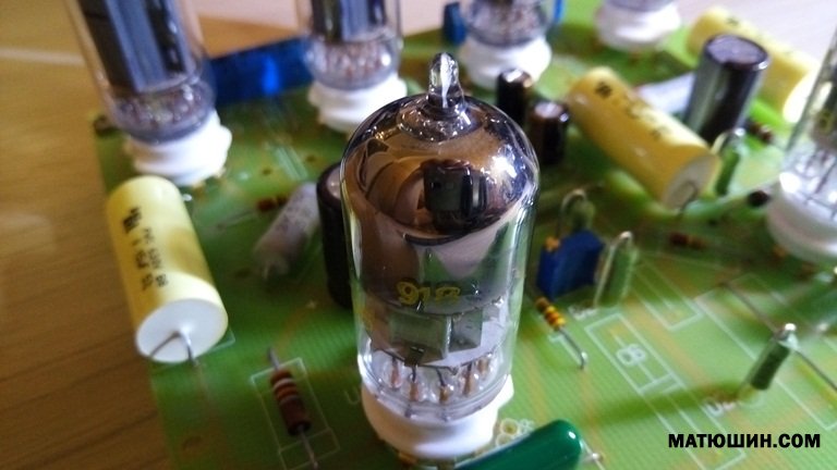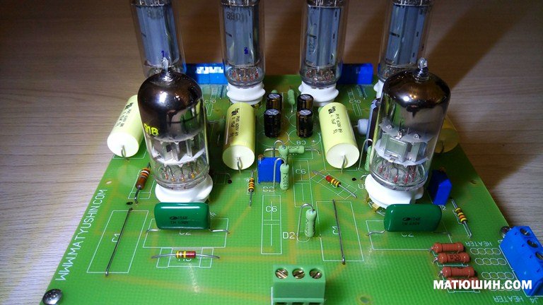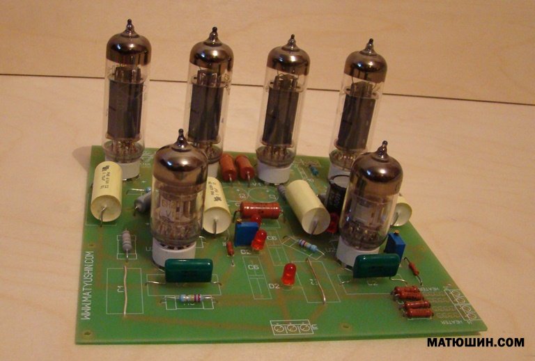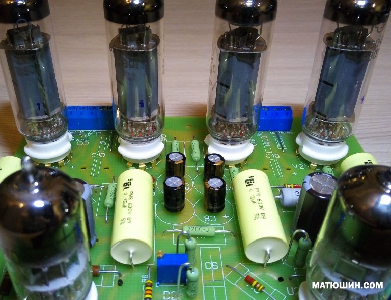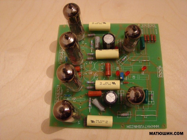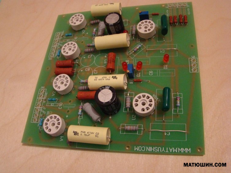 Данный проект изначально был опробован на изделии FM12 (раздел Фонокорректоры и темброблоки) , FM12 достаточно хорошо себя показал, и было решено запустить его в серию несколько изменив входную часть -EF860 в последнем случае и ECC81 на выходе.Вместо ЕСС81 с успехом можно поставить 6Н1П-ев, без замены комплектующих. Для себя я решил , что эти две лампочки являются идеальной связкой. В конструкции корректора присутствует (с обратной стороны платы), регулятор-стабилизатор. с помощью которого можно отрегулировать режим работы лампы входного каскада (установка режима экранной сетки). Нижние фото, это как раз проверка изделия на работоспособность , тут в составе ламповый стабилизатор анодного напряжения и темброблок. Хочу отметить. что для такого рода изделий стабилизатор совсем не лишнее изделие. Размеры печатной платы 70х160мм