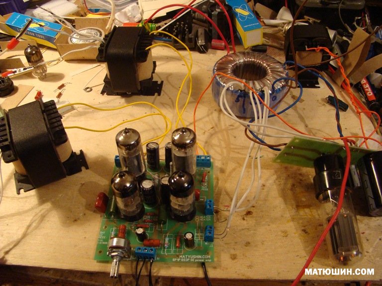 Раскиданный на столе макет с кенотронным питанием. Причесывать ничего не стал-рабочая ситуация. Усилитель для души.