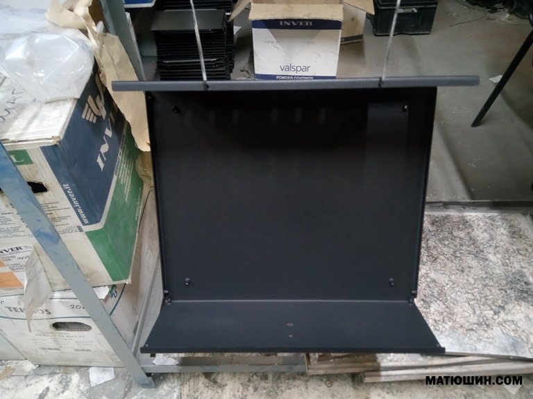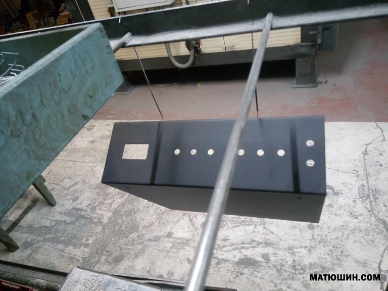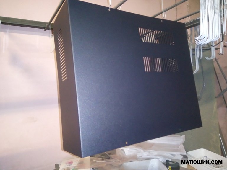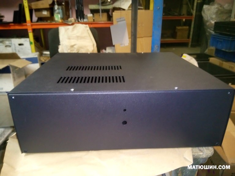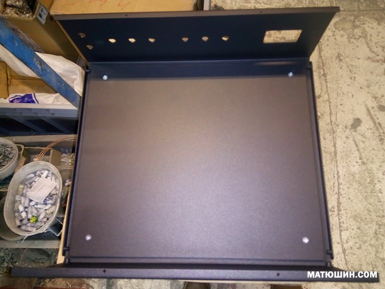 Материал сталь 1,5мм (2мм накладка), краска порошковая, отверстия под акустику и стерео вход  10мм, разъем под блок сеть (в комплекте). на передней панели отверстие под  Альпс рекомендуемый диаметр ручки 39-40мм., на фото показан процесс покраски и сушки после электро печи.