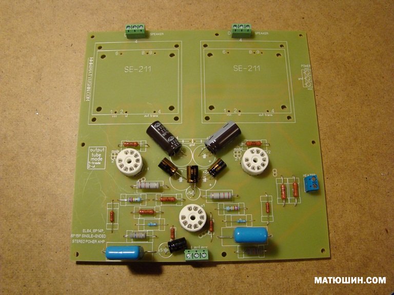 МИНИ-МОдноплатный ( не считая БП) однотактный с претензией на HI-END ламповый усилитель. Я бы сказал все сделано для людей, вставил детали.,вставил трансформаторы все это распаял и усилитель готов , при стандартных деталях с моего сайта усилитель в настройке не нуждается, и собирается за вечер.Режим работы предпологается триодный и ультралинейный. На входе 6Н2П-ЕВ, я ставил 6Н1П-ВИ- результат отличный мне прозрачность больше понравилась с 6Н1П, хотя конечно мощность несколько упала, с (3,5 до 2,5Вт) но это я по слуху, специально не замерял ,но для чувствительных колонок, а именно сюда такие и нужны от 95Дб более чем достаточно.В рабочий вариант я поставил детали самые простые . но даже с ними усилитель отыграл просто замечательно. Плата размером 180х180мм.(2мм толщиной),что позволило задать посадочные места под брендовые резисторы и конденсаторы. ТВЗ-211, дают без проблем полосу от 10 Гц до 22000(-3Дб), что я считаю очень хорошим показателем для данного устройства, особенно меня порадовал низ и середина, с 6Н1П вообще кристально чистая.. БП. предпологается двух типов , мостовой на диодах и кенотронный. Будет для него и корпус , вариант с кенотронным питанием , кенотрон 5Ц4С. НА плате в принципе все продумано . даже место под колпаки на выходные трансформаторы. Радиолампы в базовом образце стоят 6П15П, с Успехом можно ставить и 6П14П и импортные аналоги.