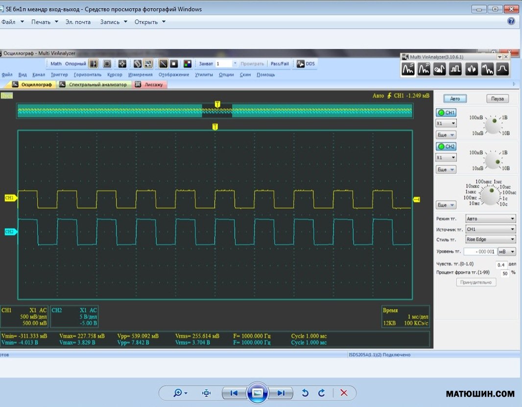 Меандр 1000ГЦ сравнения формы сигнала вход /выход (желтый входной сигнал), в норме