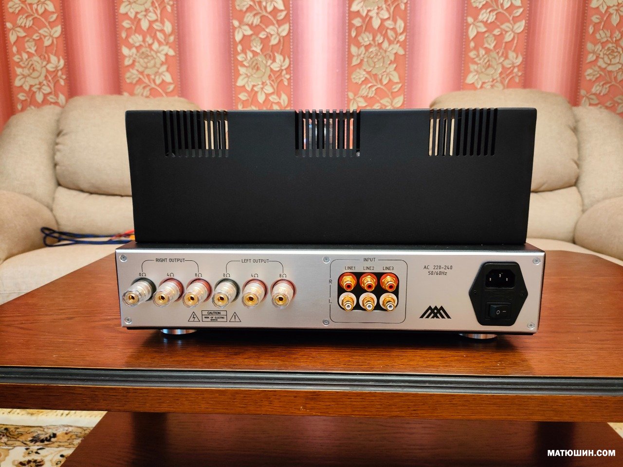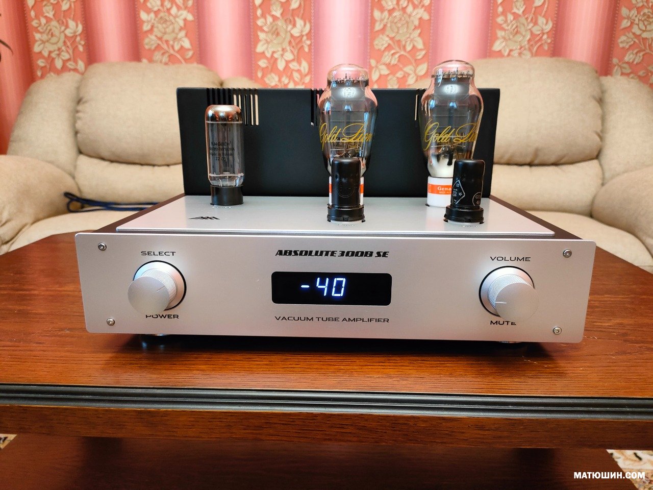 Однотактный усилитель на прямонакальном триоде 300В. Без обратной связи. Стабилизатор анодного напряжения входной лампы. Стабилизатор накала 300В с авто переключением полярности. Задержка включения Анодного напряжения. Дежурное питание. Полное управление с пульта. Селектор на три входа.