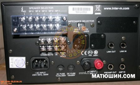 В усилитель могут быть установлены блоки тюнера Inter-M PAM-T, кассетного магнитофона Inter-M PAM-D (в настоящее время уже не поставляется) и CD-проигрывателя Inter-M PAM-CDA, для чего на лицевой панели есть два отсека. Следует, однако, учесть, что одновременное подключение блоков Inter-M PAM-D и Inter-M PAM-CDA не допускается. На выходе усилителя стоит кнопочный селектор на 5 зон оповещения, позволяющий выбирать как любую из зон, так и все сразу. Суммарная мощность нагрузки (мощность громкоговорителей) НЕ ДОЛЖНА превышать номинальную мощность усилителя. Индикатор уровня сигнала позволяет контролировать аудиосигнал на выходе усилителя. С помощью 2-х полосного регулятора тембра можно изменять АХЧ выходного сигнала.