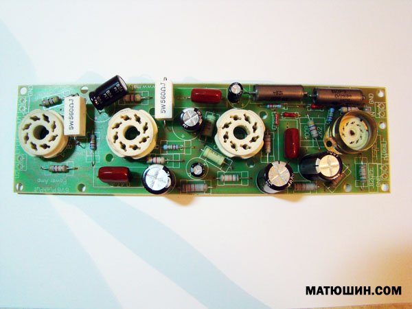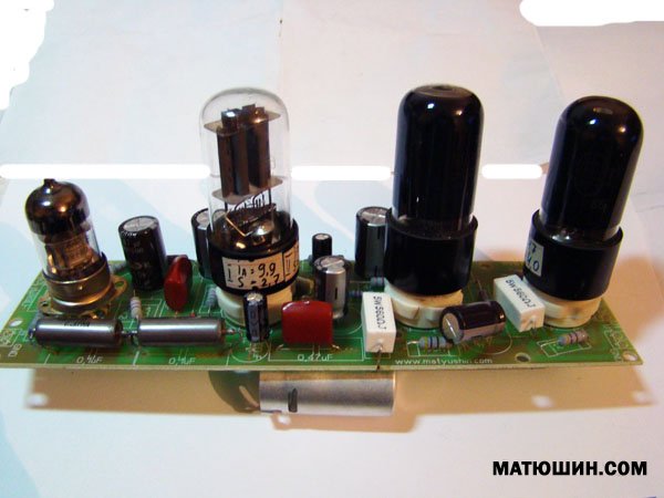 Лампочки 6Н2П-ев, так же на вход можно ставить 6Н23П.Накал постоянным током естественно! Возможна установка ламп типа 12АХ7. Работает достойно! Паразитных шумов нет даже с открытыми входами! За две голышки 700р.