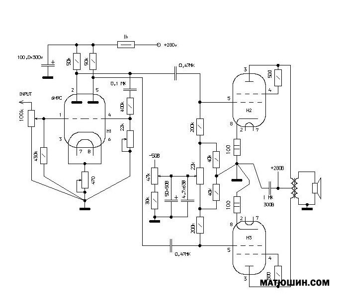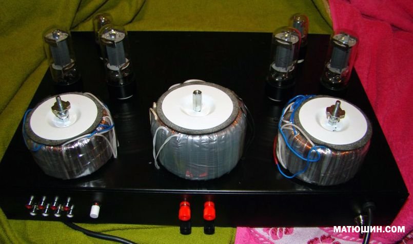 Это вариант в корпусе 6н9с и 6п3с с электронным коммутатором (используется часть HI-FI микросхемы TDA9860). Независимый электронный регулятор громкости! Под колпаками все тороиды. В центре кенотрон, можно без него. Выполнен монтаж (внутри печатные платы на два разных канала). Отдельный блок питания + Стабилизаторы напряжения на всю электронику. Бумага-масло переходные конденсаторы. Габариты 440 х 370 х 50 мм. Вес 10 кг. Высота колпаков 100 мм. Выходная мощность 2 х 15 Вт. Полоса частот 10-25000 Гц. Без провалов до 18000 Гц. Дроссель 10 Гн.