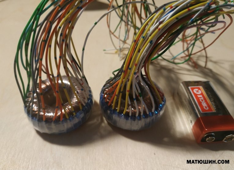 Для осуществления замысла заказал Сергею Васильевичу, намоточные изделия которого мне всегда нравились, трансформаторные аттенюаторы по отработанной карте намотки, составленной Сергеем Васильевичем, и которые были намотаны на отборных двойных кольцах из пермаллоя D=40 мм качественным медным проводом. Коэффициент передачи 1:1. Получились такие характеристики: сопротивление первичной обмотки по меди = 162 Ома. R вторичной обмотки по меди = 197 Ом. Индуктивность первичной и вторичной обмоток более 110 Генри.